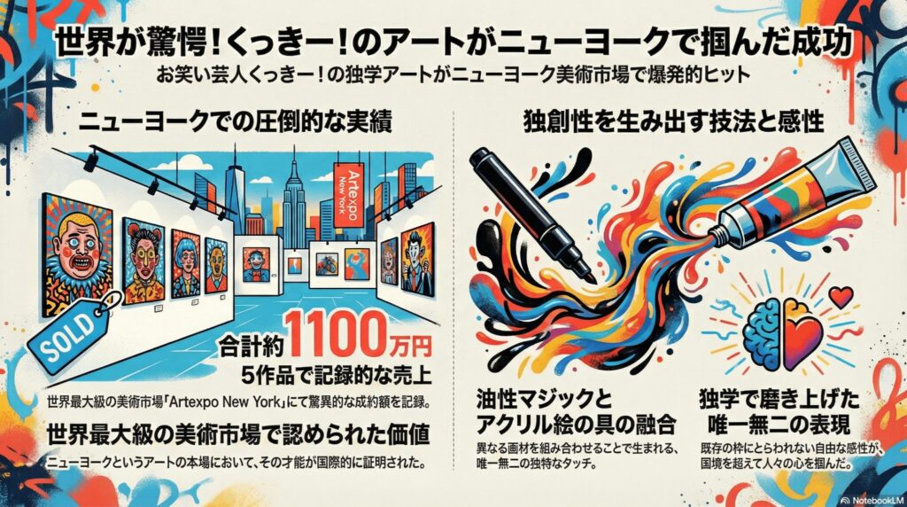 くっきー!さんの魅力は、お笑いだけにとどまりません。彼の描く絵画や制作するオブジェなどのアート作品は、海外でも高く評価されています。