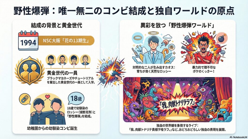 1994年、18歳になったくっきー!さんは吉本興業の養成所であるNSC大阪校に入学します。ここはブラックマヨネーズやチュートリアルなど数々のスターを輩出した「花の13期生」でした。