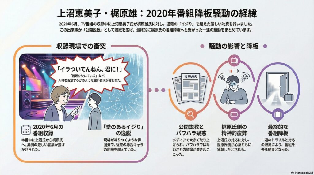事の発端となったのは、2020年6月に行われた番組収録での出来事だと言われています。報道によると、本番中に上沼さんが梶原さんに対して、かなり厳しい言葉を浴びせたとされています。