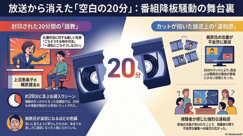 実は、騒動のきっかけとなった収録回では、放送されなかった「お蔵入りシーン」があったと言われています。関係者の話によると、その時間は約20分にも及んだとか。